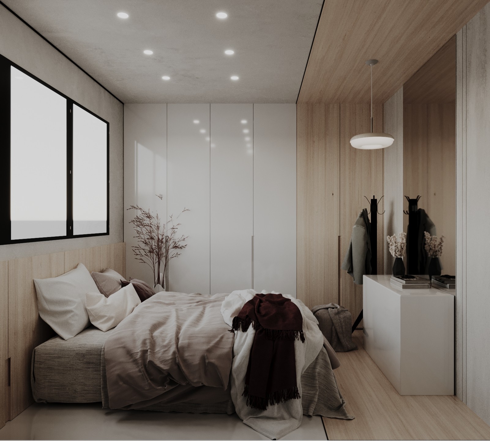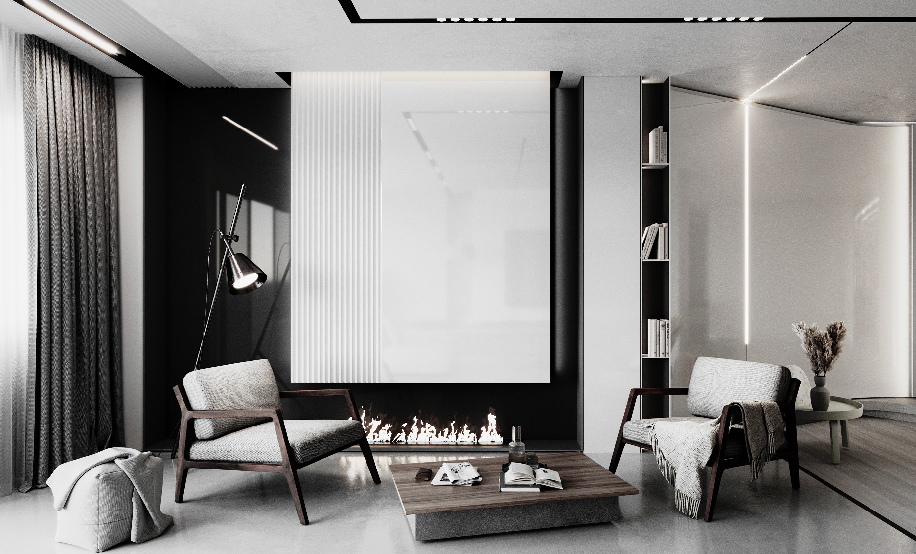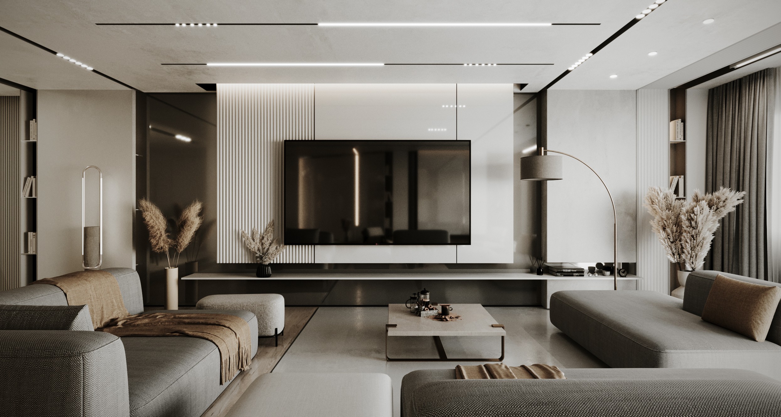 A combination of timber and polished concrete flooring adds warmth and texture while keeping the palette restrained. Recessed linear LED lighting provides soft, even illumination and highlights the clean architectural lines across the ceiling and joinery.