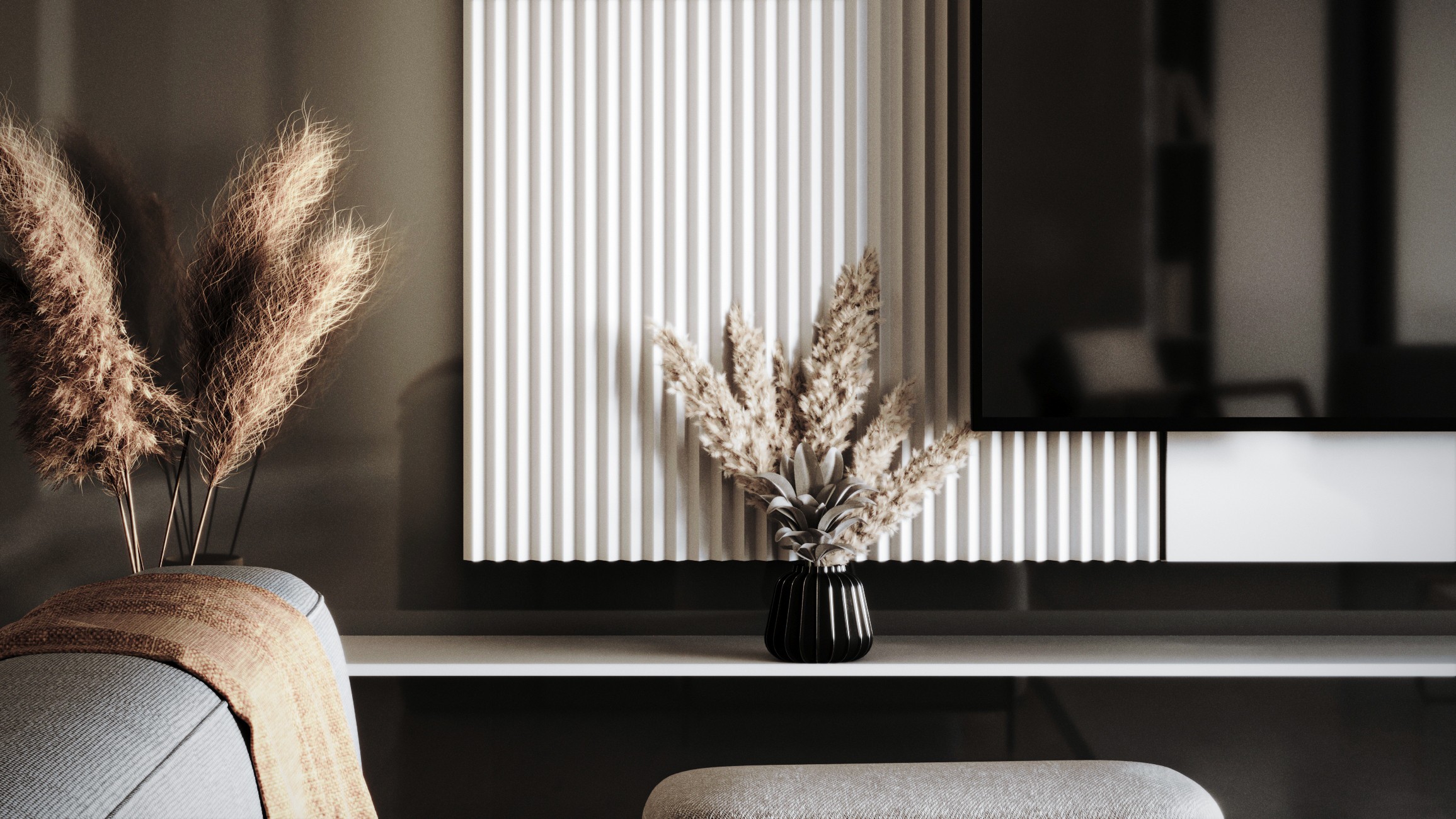 Smoked glass behind the TV creates a refined backdrop, adding depth and contrast to the living space while reflecting light subtly throughout the room. It also helps conceal wiring and media components, keeping the aesthetic clean and uncluttered.