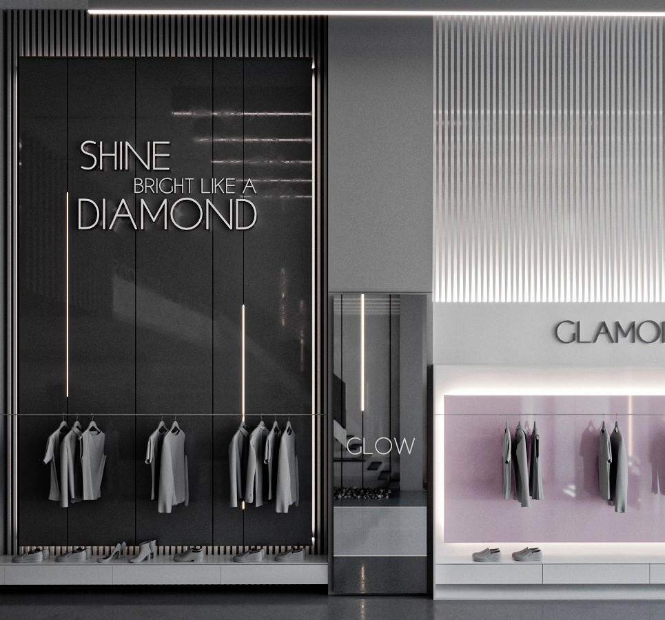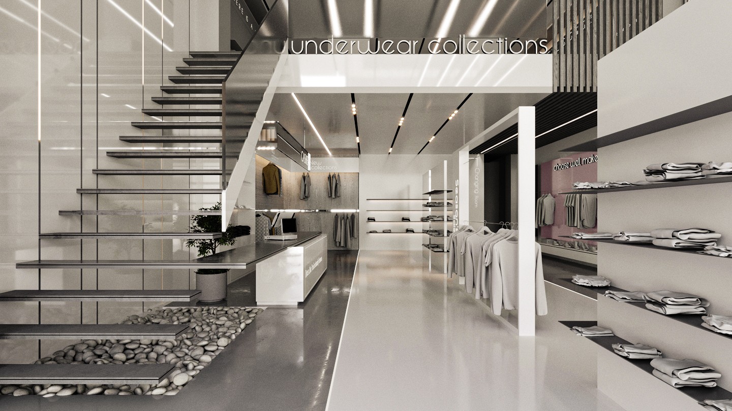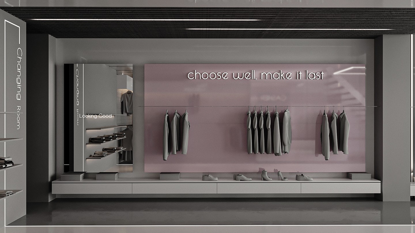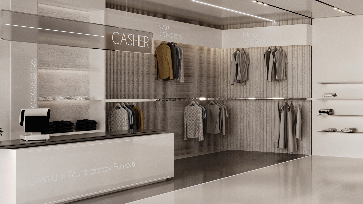 To reflect the nature of the merchandise, a modern design approach was adopted, with a neutral palette of grey and white used to highlight the garments. Subtle accents of purple were introduced as a complementary colour, adding depth and richness to the interior while reinforcing the brand identity.